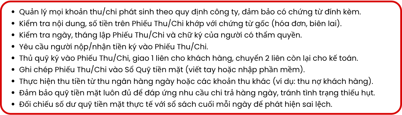 – Đối với giao dịch tiền mặt tại quỹ: Khi nhận được Phiếu thu hoặc Phiếu chi (do kế toán lập) kèm theo chứng từ gốc , Thủ quỹ phải:
