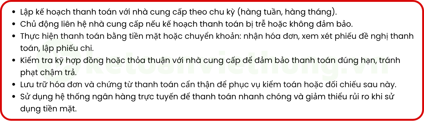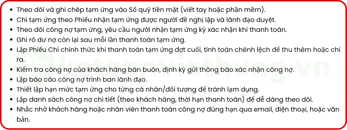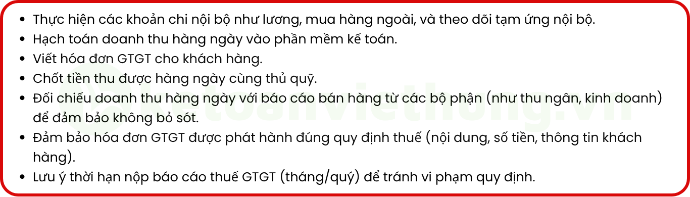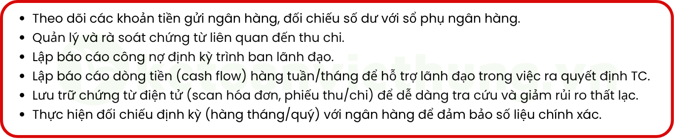 Đây là hoạt động nhằm đảm bảo dòng tiền được kiểm soát chặt chẽ, cung cấp thông tin chính xác để lập báo cáo tài chính và phục vụ các yêu cầu kiểm tra, giải trình với cơ quan thuế.